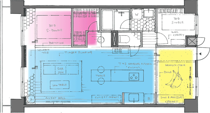 独立性を保ちながら緩くつながりあう、18畳もの広いLDK 空間。 -